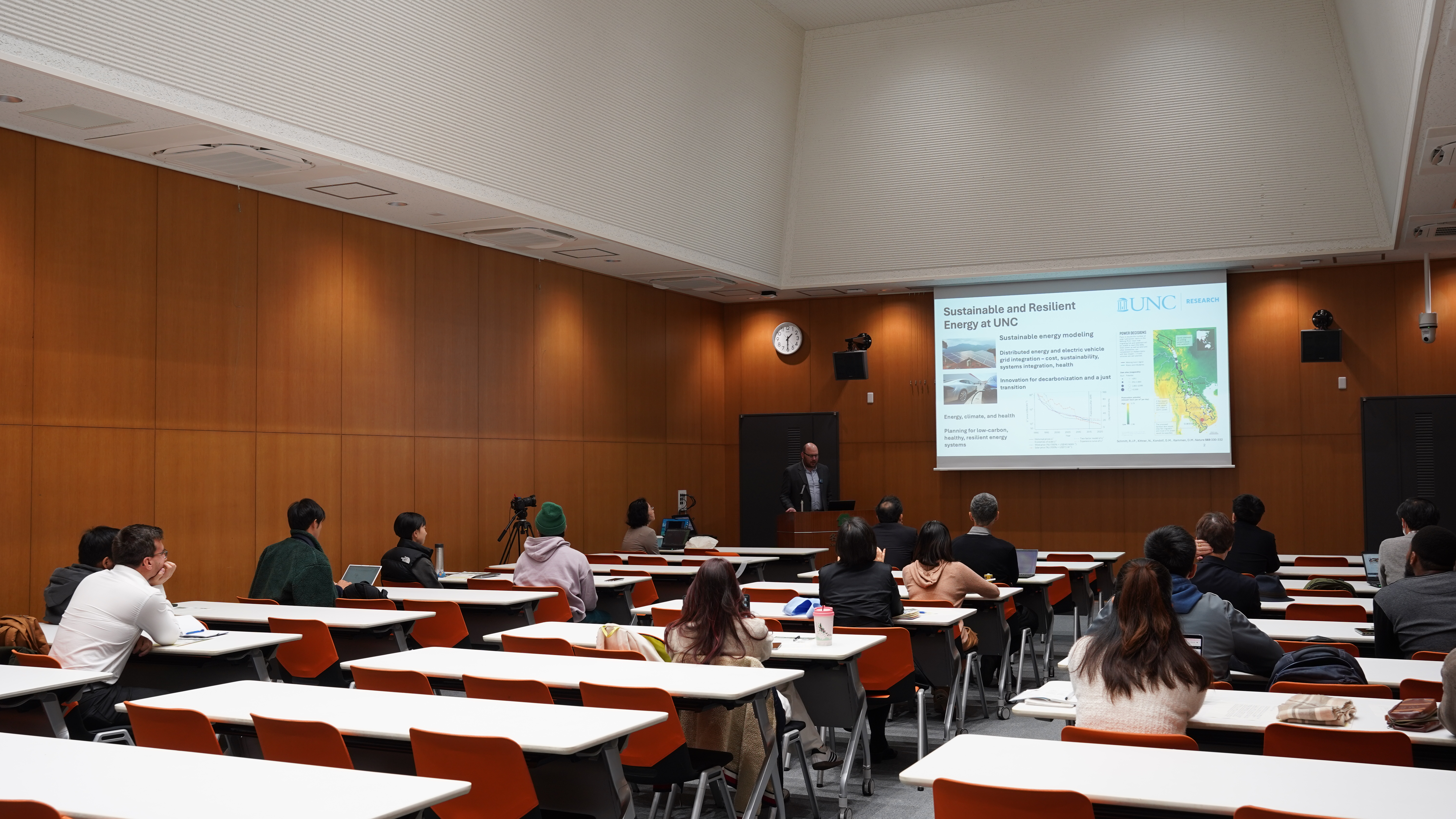 Associate Professor Noah Kittner of the University of North Carolina at Chapel Hill was invited to address the keynote. Following this, a discussion on sustainable transportation and energy took place between Dr. Kittner, international program students, and other graduate students.